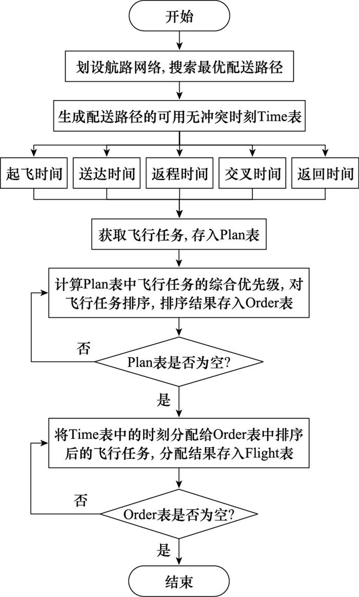 目前, 面向低空物流无人机的研究多集中于任务分配与路径规划[5 -12 ] , 面向飞行计划的研究集中于飞行调度[15 , 17 -21 ] 和管理系统[13 -14 , 16 ] , 但面向低空无人机运输中飞行计划调配流程的研究较少。无人机飞行计划预先调配可从高度、航路和时间的角度出发, 由于调整高度和航路存在局限, 一是城市低空可供调整的飞行空间有限, 往往不允许无人机产生大幅度空间变动; 二是无人机电量、承重等性能有限, 执行任务的空间变动会降低运输效率。因此, 本文研究基于实际运输需求, 从时间调整的角度出发, 以飞行计划成本最低为调配目标, 建立无人机飞行计划预先调配模型, 设计考虑综合优先级的飞行计划预先调配算法求解, 生成无冲突的时刻表, 为飞行任务排序后分配起飞时刻, 以实现飞行计划的预先调配。