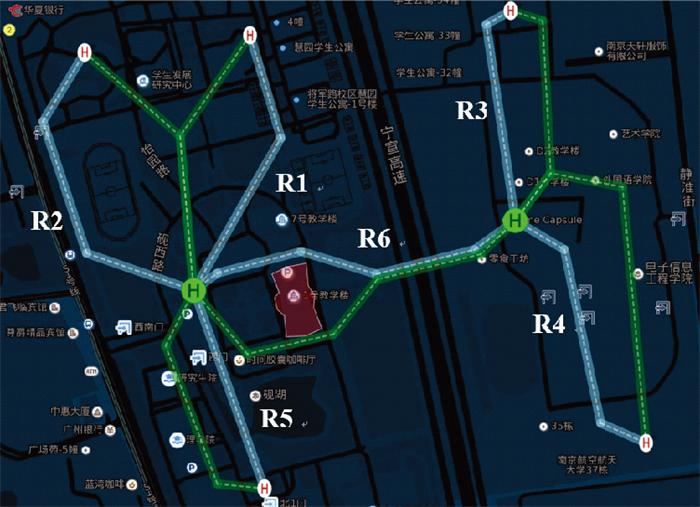 根据配送点和收货点在航路网络中的位置, 搜索从配送点至收货点避让障碍物的低空飞行路径即为无人机配送路线。因两校区之间存在高速公路, 经天桥相连, 无人机只可在天桥上方低空空域往返两区, 且去程与回程分别在保持纵向间隔的不同高度层, 不存在航路冲突。如图 3 所示, 其中绿色圆点表示配送点, 白色圆点表示收货点, 配送点和收货点的蓝色航路表示无人机去程, 绿色航路表示无人机回程。