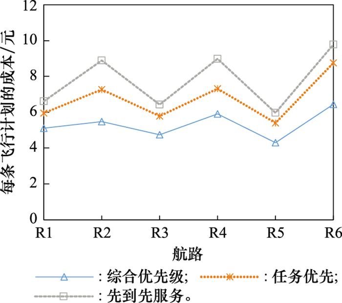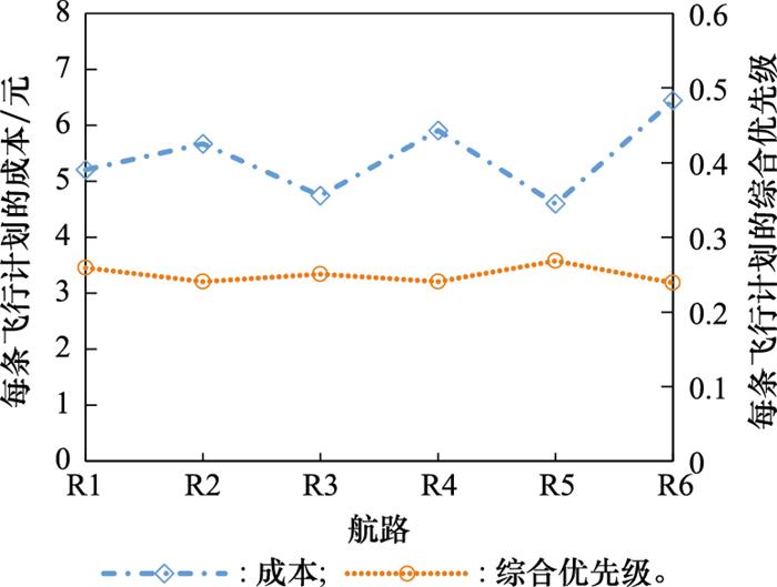由图 4 可知, 每条飞行计划的成本与综合优先级变化趋势相反, 因为优先级高的计划会先进行排序, 分配到较早的时刻, 出现延误的可能性小, 因此成本低。对于每条航路, 待分配计划的数量越多, 每条飞行计划的成本越高, 由于航路R5距离最短, 每条计划的成本最低, 航路R6距离最长, 每条计划的成本最高。