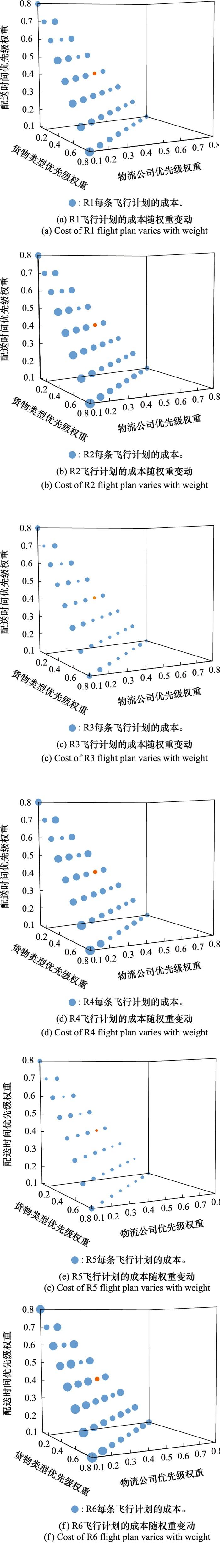 由图 6 可知, 点的大小表示飞行计划成本的高低, 随着权重ω 1 、ω 2 和ω 3 取值变动, 不同航路之间成本变动趋势相似, 取图 6 中成本最小的点, 如橙色标注所示, 绘制其至3个坐标轴的垂线, 可知使成本最低的综合优先级最优权重组合为ω 1 =0.2, ω 2 =0.4, ω 3 =0.4, 航路网络中每条飞行计划的成本为5.42元。
