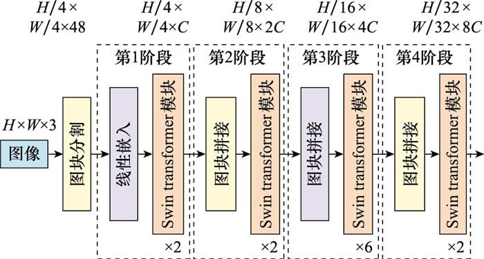 为了得到多尺度的特征信息, 还需要构建一个层级式结构, Swin Transformer网络中设计了图块拼接模块, 来实现类似CNN中池化操作, 经过拼接过后图像的宽高尺寸减半, 通道数翻倍, 而后再通过Swin Transformer模块, 这样的结构以串联的形式相连, 即图 1中的第2阶段到第4阶段。