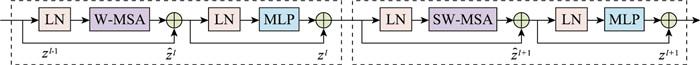 随后数据进入Swin Transformer模块, 经归一化后, 进入窗口多头自注意力(windows multi-head self-attention, W-MSA)计算模块, 将图像块进一步划分成互不重叠的区域, 并在区域内计算自注意力; 多层感知机(multilayer perceptron, MLP)是一个使用GeLU函数作为激活函数的前馈网络, 旨在完成非线性变换, 提升算法拟合能力。由于在W-MSA中, 只会在每个窗口内进行自注意力计算, 所以窗口与窗口之间是无法进行信息传递的。为此, 引入了偏移(shifted W-MSA, SW-MSA)模块, 在第L层划分互不重叠窗口后, 在第L+1层内偏移半个窗口距离重新划分窗口, 使得不同层中有部分窗口的信息得以交互, 以上操作可以归结为第一阶段, Swin Transformer模块结构如图 2所示。