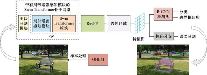 本算法使用Swin Transformer作为骨干网络, 完成特征提取工作, 图像进入图像分割模块后形成序列化小块, 并沿通道方向展平, 通过线性嵌入模块完成线性到非线性再到线性的3次变换; 在进入Swin Transformer块前, 先通过局部增强感知(local enhanced sensing, LES)模块, 旨在进一步抑制无效特征, 增强有效参数, 提高上下文信息之间的交互; 在特征融合阶段使用RevFP网络[17], 在采用局部融合操作的同时, 集成高级与低级特征, 获得更好的融合效果和更低的延迟; 在网络的训练阶段, 使用在线困难样例挖掘(online hard example mining, OHEM)[18]方法, 解决自制数据集难易样本不均衡, 训练效果不理想的问题, 通过设置负样本池反复迭代, 使算法在小样本数据集上获得更好的效果; 最后使用基于Mask R-CNN的检测头, 完成实例分割任务。算法整体框架如图 3所示。
