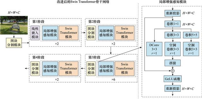 在Swin Transformer模型中, 为了在与图像大小成线性关系的计算复杂度下尽可能地实现上下文语义信息的“全局”范围交互, 在层次化结构中使用偏移窗口方案来实现不同窗口间的信息交互。但实际上, 每次偏移半个窗格, 在空间上依然存在大量上下文信息不能很好地交流, 为此, 本文提出了在Swin Transformer模块前插入一个局部增强感知模块, 旨在进一步提升信息交互能力, 拓展感受野尺寸, 具体结构如图 4所示。
