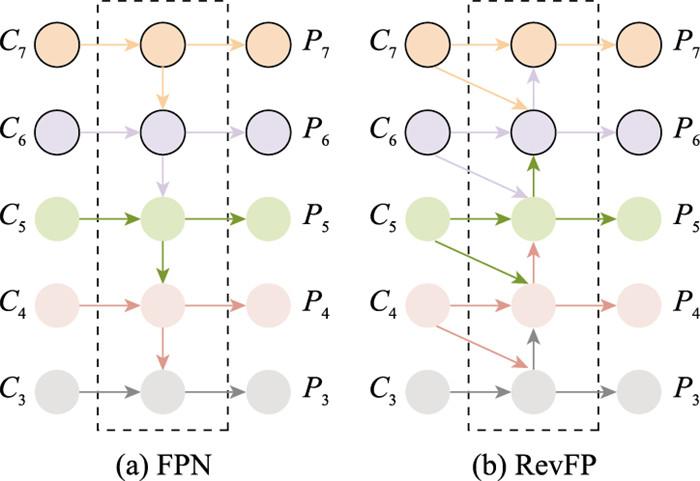 在特征融合阶段, 特征金字塔网络[25](feature pyramid networks, FPN)是目前最为常用的选择, 其结构如图 5(a)所示。后续相关研究提出了多种不同的架构, 如路径聚合网络(path-aggregation network, PANet)[26], 双向FPN(bi-directional FPN, BiFPN)[27]等, 这些方法使用了不同形式的双向特征融合。相关实验表明, 以上改进结构均能有效改善网络性能, 已在目标检测、实例分割领域得到了广泛应用, 但这些网络通常是以固定顺序堆叠特征金字塔, 更长的信息链路, 会降低推理速度。此外, 由于FPN中仅在近邻层级特征进行了局部融合, 这就导致非相邻特征的语义信息会被稀释。文献[17]提出了RevFP网络, 这是一种利用局部双向特征融合的简化的双向金字塔推理架构, 相比于其他双向金字塔架构, RevFP具有更好的性能、更小巧的模型和更低的延迟, RevFP结构如图 5(b)所示。
